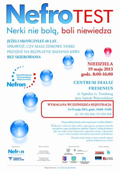 Mieszkańcy Tarnobrzega i powiatu tarnobrzeskiego, którzy ukończyli 40 lat, będą mieli okazję za darmo i bez skierowania przebadać krew pod kątem chorób nerek. W niedzielę, 19 maja w ramach ogólnopolskiej kampanii NEFROTEST, wykwalifikowany personel Centrum Dializ Fresenius w Tarnobrzegu przeprowadzi testy krwi 400 osobom. Warunkiem uczestnictwa w bezpłatnych testach krwi jest wcześniejsza rejestracja telefoniczna. Zapisy prowadzone będą 14 i 15 maja w godz. 10:00-15:00, pod dwoma numerami telefonów: 515 656 848 i 515 656 858. Przy rejestracji wymagany będzie numer PESEL. Szacunkowo, w Polsce problemy z nerkami ma ponad 4 miliony osób. Badania są częścią ogólnopolskiej kampanii informacyjnej 'Nefrotest, której organizatorem jest Nefron, Sekcja Nefrologiczna Izby GospodarczejMedycyna Polska, zrzeszająca większość polskich stacji dializ.