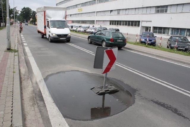 Zarządca drogi na razie te największe ubytki oznacza słupkami, by były omijane przez kierowców.