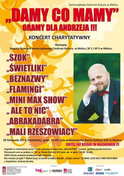 W koncercie charytatywnym wezmą udział zespoły taneczne z Samorządowego Domu Kultury, SP 1 oraz SP 3 w Mielcu: „Szok”, „Świetliki”, „BezNazwy”, „Flamingi”, „Mini Max Show”, „AleToNic”, „Abrakadabra”, „Mali Rzeszowiacy”. Cały dochód przekazany będzie na leczenie chorego na chłoniaka Andrzeja Burdzy.
