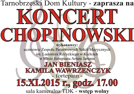 15. listopada w Tarnobrzeskim Domu kultury odbędzie się Koncert Chopinowski.