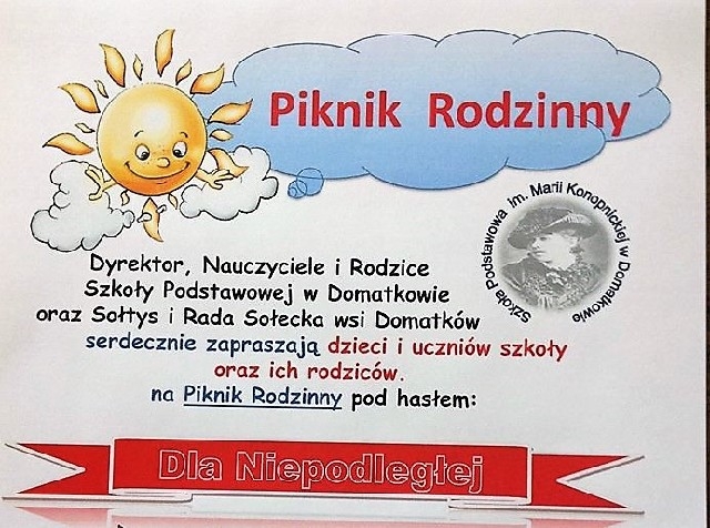 Dyrekcja, nauczyciele i rodzice uczniów Szkoły Podstawowej w Domatkowie koło Kolbuszowej zapraszają w sobotę (19.05) do tej miejscowości na piknik rodzinny, który odbędzie się pod hasłem 'Dla Niepodległej'. Wydarzenie, które będzie miało miejsce na placu przy miejscowej szkole, rozpocznie się o godzinie 14.00.
