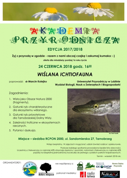 Wiślana ichtiofauna będzie tematem wykładów w ramach Akademii Przyrodniczej. Na wydarzenie w najbliższą niedzielę, 24 czerwca, zaprasza Tarnobrzeskie Centrum Natura 2000 z siedzibą w Zamku Dzikowskim. O godzinie 16.00 wykład dla młodzieży, a o 17.00 dla dorosłych.
