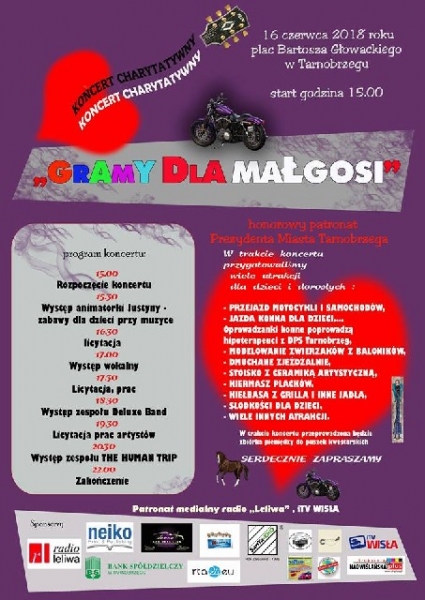 Gramy dla Małgosi – pod takim hasłem już w najbliższą sobotę odbędzie się na Placu Bartosza Głowackiego w Tarnobrzegu koncert charytatywny. Organizatorzy akcji chcą pomóc kobiecie, która jest po dwóch operacjach stawu biodrowego. Zebrane podczas akcji pieniądze mają zostać przeznaczone na rehabilitację.