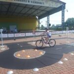 Dzieci korzystały z mobilnego miasteczka rowerowego, gdzie mogły poprawić technikę jazdy i przygotować się do egzaminu na kartę rowerową: