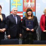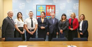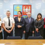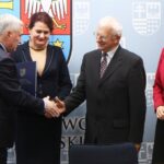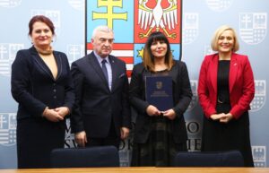 Marszałek Andrzej Bętkowski oraz wicemarszałek Renata Janik w obecności radnej Sejmiku Województwa Magdaleny Zieleń podpisali umowy na dofinansowanie trzech projektów z przedstawicielami Centrum Biznesu i Promocji Kadr z Ostrowca Świętokrzyskiego, tamtejszej Wyższej Szkoły Biznesu i Przedsiębiorczości oraz Wodnego Ochotniczego Pogotowia Ratunkowego w Kielcach.