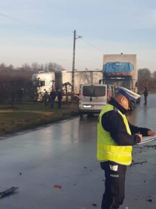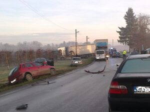 Źle wyprofilowana droga jest jedną z przyczyn kolizji ośmiu pojazdów na drodze powiatowej obok cmentarza w Obrazowie w powiecie sandomierskim – tak przypuszcza wójt gminy Obrazów Krzysztof Tworek i apeluje do zarządu dróg powiatowych o interwencję w tej sprawie. Do zdarzenia z udziałem ośmiu samochodów, w tym tira doszło dziś rano, gdy droga była oblodzona. Poszkodowana została kobieta w zaawansowanej ciąży.