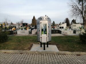 Zniczomat stoi przy głównej bramie wjazdowej na cmentarz.