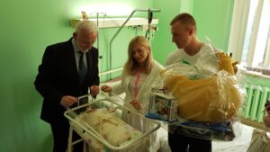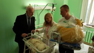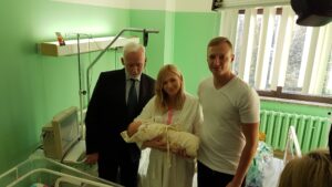 Dariusz Bożek wręczył rodzicom chłopca upominek, pogratulował i złożył życzenia. –Cieszymy się z każdego dziecka – powiedział prezydent.