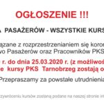 Od środy, 18 marca wszystkie kursy PKS Tarnobrzeg będą odwołane. Zarząd przedsiębiorstwa podjął taką decyzję w trosce o zdrowie pracowników i pasażerów w związku z rozprzestrzenianiem się koronawirusa. Zarządzenie obowiązuje do 25 marca z możliwością przedłużenia.