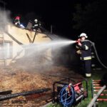 Na miejscu okazało się, że ogniem objęte było poddasze tzw. letniej kuchni. Z racji, iż budynek znajdował się w pobliżu innych zabudowań było realne zagrożenie przeniesienia się ognia na inne budynki. Na poddaszu znajdowała się słoma, którą trzeba było wyrzucić i przelać wodą. Po ugaszeniu ognia strażacy musieli częściowo rozebrać budynek. Akcja trwała kilka godzin.