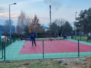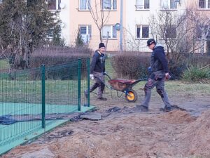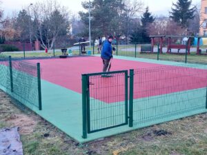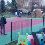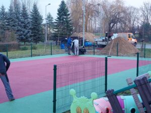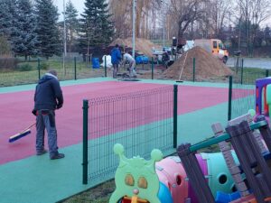 Trwa wymiana nawierzchni poliuretanowej na placu zabaw dla dzieci żłobkowych przy Przedszkolu nr 5 w Sandomierzu.