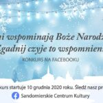 ’Znani wspominają Boże Narodzenie. Zgadnij czyje to wspomnienie” to tytuł konkursu facebookowego zorganizowanego przez Sandomierskie Centrum Kultury oraz Urząd Miejski w Sandomierzu. Aby wziąć udział w konkursie nie trzeba wychodzić z domu. Wspomnienia znanych Sandomierzan zamieszczane są na facebookowym profilu Sandomierskiego Centrum Kultury do 23 grudnia 2020 roku (z wyjątkiem weekendów). Każdego dnia można odgadnąć jedno wspomnienie.