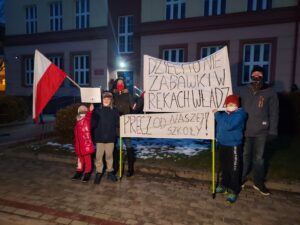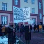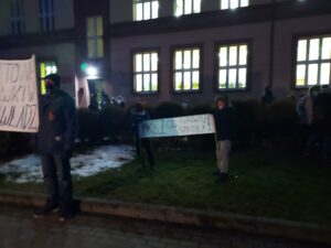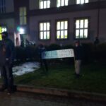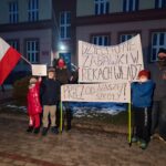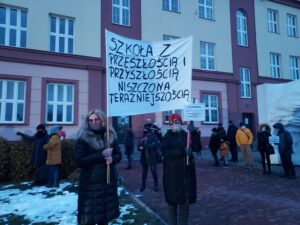 Przeciwko przenosinom szkoły protestują rodzice uczniów, którzy zorganizowali pod budynkiem szkoły spotkanie protestacyjne: