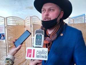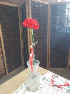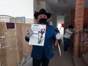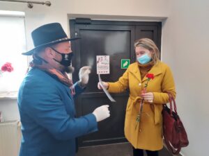 Z goździkiem w jednej dłoni i rajstopami w drugiej witał dyrektor Miejsko – Gminnego Ośrodka Kultury i Sportu w Koprzywnicy Krzysztof Pitra panie, które przyszły do Domu Kultury na obchody Dnia Kobiet: