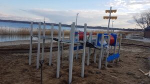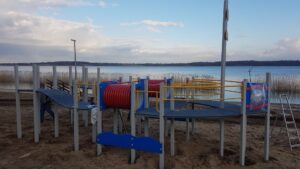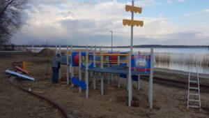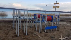 Roboty budowlane nad Jeziorem Tarnobrzeskim wciąż trwają. Dziś (poniedziałek 22 marca) nad akwen przywiezione zostały elementy trzech placów zabaw. Przy ulicy Żeglarskiej montowany jest statek, na który składa się kilka urządzeń zabawowych.