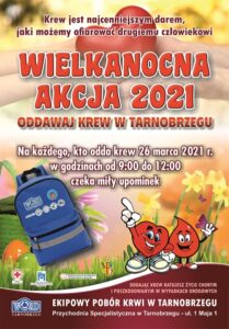 Plecak z odblaskiem otrzyma każdy kto 26 marca odda krew w Tarnobrzegu. Zbiórka zostanie przeprowadzona w godzinach od 9.00 do 12.00, w punkcie ekipowego poboru krwi mieszczącym się w Przychodni Specjalistycznej przy ulicy 1 Maja 1. Hasło akcji to „ Świąteczny dar serca”.