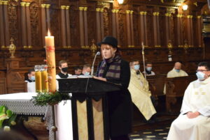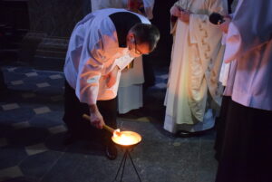 Liturgię rozpoczął obrzęd poświęcenia ognia oraz zapalenia paschału, który symbolizuje Zmartwychwstałego Chrystusa. Następnie diakon odśpiewał Orędzie Paschalne, wyjaśniające symbolikę światła, którym jest Chrystus powstający z mroku i śmierci do życia. Rozbudowana w tym dniu Liturgia Słowa przedstawia dzieje ludzkości od grzechu pierwszych rodziców przez historię Izraela, aż do męki, śmierci i zmartwychwstania Jezusa Chrystusa.