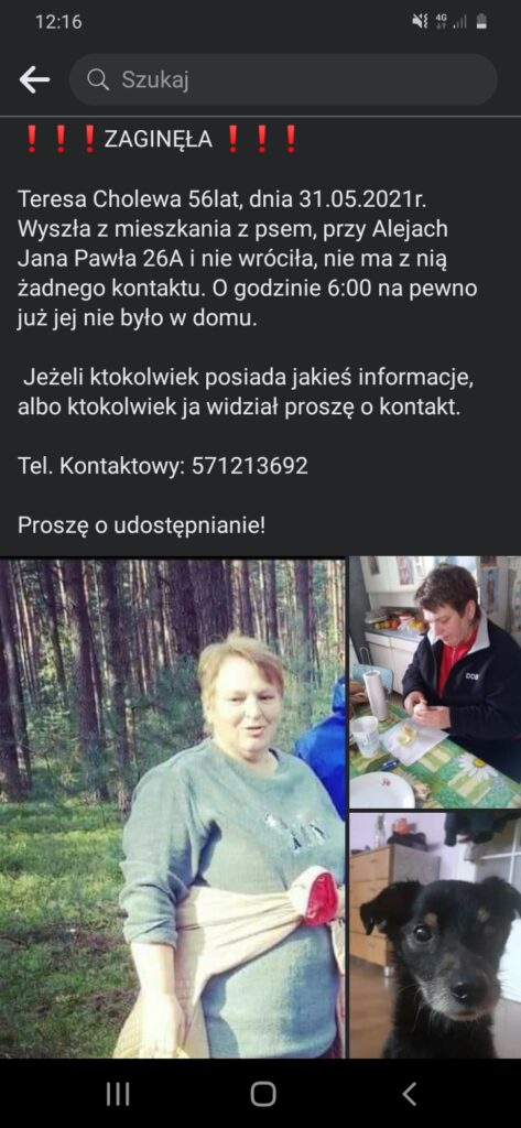 Wydział Kryminalny Komendy Powiatowej Policji w Stalowej Woli prowadzi poszukiwania zaginionej Teresy Cholewa, 57-letniej mieszkanki Stalowej Woli. Zaginiona wyszła z domu przy Al. Jana Pawła II na spacer z psem 31 maja 2021 roku około godz. 6. Do chwili obecnej nie powróciła do miejsca zamieszkania i nie nawiązała także kontaktu z rodziną.