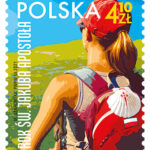 Znaczek nawiązuje do międzynarodowego symbolu wszystkich pielgrzymujących do Santiago de Compostela: