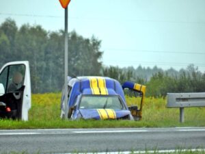 Na drogach ślisko, w regionie wciąż opady deszczu dlatego kierowcy powinni zachować szczególną ostrożność i zwolnić. Do groźnie wyglądającego zdarzenia doszło za rondem w Grębowie w kierunku Stalowej Woli. Samochód wpadł w poślizg, uderzył w barierkę, zatrzymał się w rowie, na dachu: