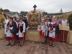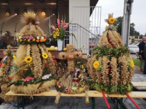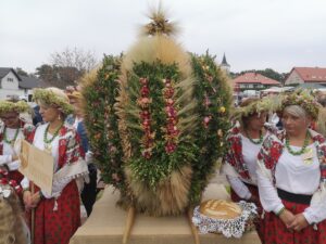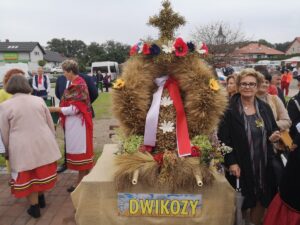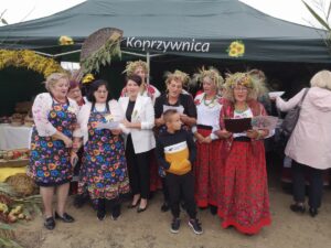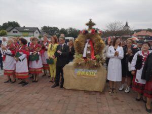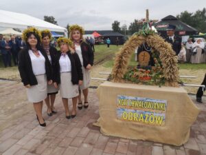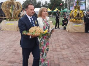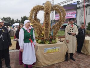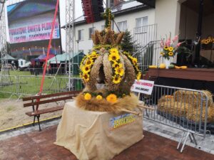 Wieniec z gminy Koprzywnica przygotowali sołtysi oraz przewodniczący osiedla. Sołtys wsi Zbigniewice Kolonia Anna Baran powiedziała, że prace nad wieńcem rozpoczęły się na długo przed dożynkami. – Trzeba było przede wszystkim zebrać zboże, które w tym roku jest zielone. Nie ma dojrzałego, ponieważ opady deszczu sprawiły, że na polach bardzo szybko ono czerniało – mówi.