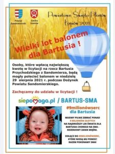 A balonem przelecieć się będą mogły osoby, które wpłacą największą kwotę w licytacji na rzecz Bartusia Przychodzkiego z Sandomierza cierpiącego na SMA. Niezwykły lot można licytować na Facebooku na stronie Bartuś – Pogromca SMA – Licytacje do soboty 28 sierpnia do godz 21.00.