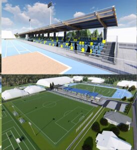 - Boisko treningowe wielofunkcyjne o nawierzchni z trawy sztucznej o wymiarach 74x115m (w tym pole gry 68x105m) przeznaczone do piłki nożnej a także do hokeja na trawie. Hala pneumatyczna nad boiskiem będzie zapewniała możliwość uprawiania sportu przez cały rok.