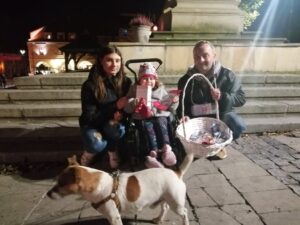 Zosia ma już długą drogę bólu za sobą. Po urodzeniu przeszła operację zamknięcia przepukliny oponowo- rdzeniowy, a także wstawienie zastawki komorowo- otrzewnowej. To wszystko było spowodowane tym, iż Zosia przyszła na świat z przepukliną oponowo-rdzeniową ze współistniejącym wodogłowiem. To nie koniec zmagań o lepsze jutro dla naszej córeczki. Niestety problemy zdrowotne zaczęły się mnożyć wraz z rozwojem Zosi. Kazda łza i wizyta u lekarzy to kolejny ból dla Zosi i nas rodziców, gdyż sami nie jesteśmy w stanie pomóc naszej Zosi. Stwierdzono u niej niedowład kończyn dolnych, zwichnięte biodra, przeprosty w kolanach, stopy końsko-szpotawe, niedowład spastyczny ręki prawej, zez ukryty w oku prawym, autyzm dziecięcy, pęcherz neurogenny oraz niedrożność jelit.