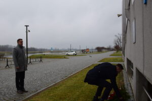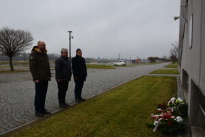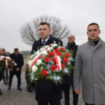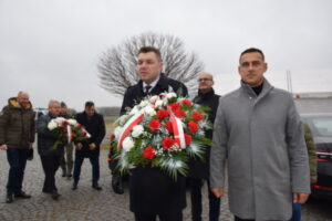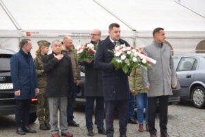 Okolicznościową wiązankę pod tablicą upamiętniającą marszałka złożył poseł na Sejm RP Marek Kwitek: