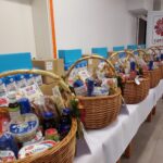 W koszach znalazły się także susz na kompot, śledzie, konserwy rybne i mięsne, ciasta świąteczne: keks i pierniczki, makarony, cukier oraz artykuły do dezynfekcji.