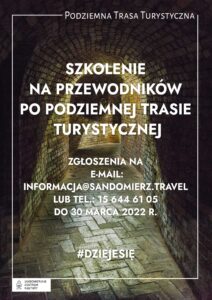 Sandomierskie Centrum Kultury organizuje szkolenie na przewodnika po Podziemnej Trasie Turystycznej w Sandomierzu. Podziemna Trasa Turystyczna to udostępniona do zwiedzania część kilkukondygnacyjnych komór i chodników znajdujących się pod miastem. Jej długość wynosi 470 m. Najgłębsze wyrobiska znajdują się na głębokości 12 m.