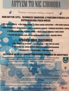 2 kwietnia obchodzić będziemy Światowy Dzień Świadomości Autyzmu. Dzień ten rozpoczyna miesiąc wiedzy na temat autyzmu. Zespół Szkół Specjalnych w Tarnobrzegu tradycyjnie włącza się w obchody.