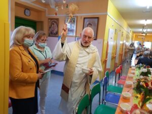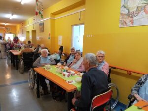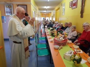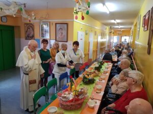 Przy wspólnym, symbolicznym, wielkanocnym stole usiedli dziś podopieczni Zakładu Pielęgnacyjno-Opiekuńczego w Tarnobrzegu, przy ulicy Dekutowskiego. Ojciec Dominikanin poświęcił pokarmy i udzielił błogosławieństwa zebranym. Było to pierwsze wspólne świętowanie pacjentów zakładu po dwóch latach przerwy spowodowanej pandemią.