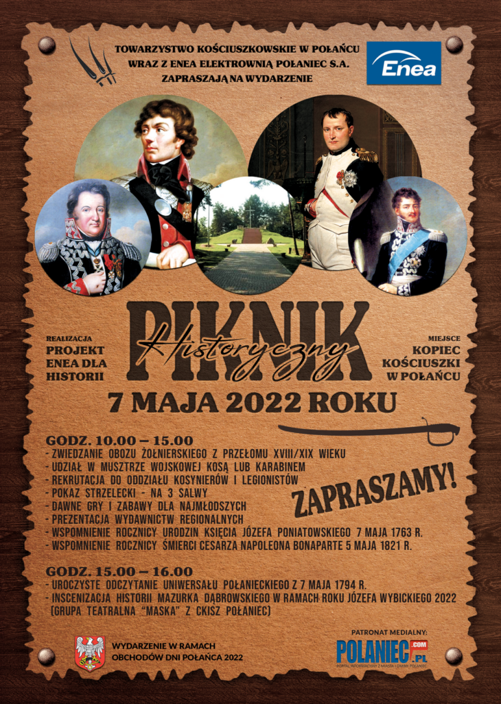 Na początku maja przypadają jeszcze dwie ważne rocznice związane z Epoką Napoleońską. 7 maja 1763 r. urodził się książę Józef Poniatowski, a 5 maja 1821 r. zmarł cesarz Napoleon. Te dwie postacie również znajdą miejsce w połanieckim wydarzeniu. Projekt z Enea będzie stanowił część historyczną organizowanych przez miasto Dni Połańca.