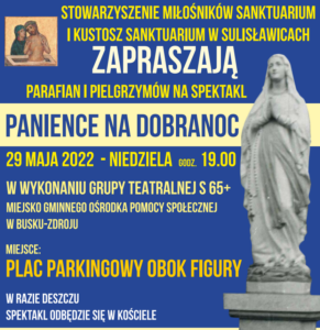W niedzielę zaś w Uroczystość Wniebowstąpienia Pańskiego o godzinie 19.00 odbędzie się spektakl w wykonaniu grupy teatralnej z Buska Zdroju pod tytułem „Panience na dobranoc”.