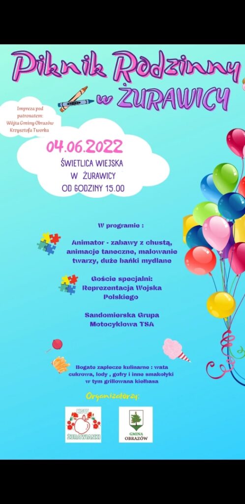 Koło Gospodyń Wiejskich w Żurawicy zaprasza w sobotę na piknik. W programie animacje dla dzieci, dmuchańce, malowanie twarzy, duże bańki mydlane. Będzie też reprezentacja Wojska Polskiego i motocykliści z Sandomierskiej Grupy Motocyklowej. Początek o godzinie 15 00.