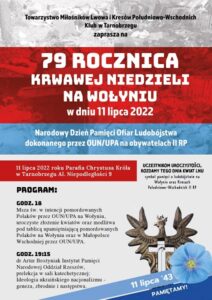 Towarzystwo Miłośników Lwowa i Kresów Południowo – Wschodnich Klub w Tarnobrzegu organizuje spotkanie w 79. Rocznicę Krwawej Niedzieli na Wołyniu. O godzinie 19.15 w sali katechetycznej kościoła pod wezwaniem Chrystusa Króla odbędzie się spotkanie z doktorem Arturem Brożyniakiem z Rzeszowskiego Oddziału Instytutu Pamięci Narodowej. Tytuł wykładu ” Ideologia ukraińskiego nacjonalizmu – geneza, zbrodni i następstwa”. Wcześniej,o godzinie 18.00 msza święta w intencji pomordowanych Polaków przez OUN/UPA na Wołyniu, uroczyste złożenie kwiatów i modlitwa przed tablicą upamiętniającą pomordowanych Polaków na Wołyniu oraz w Małopolsce przez OUN/UPA.