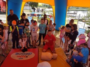Uczestnicy pikniku mogli poznać zasady udzielania pierwszej pomocy. Prezes Rejonowego Wodnego Ochotniczego Pogotowia Ratunkowego w Tarnobrzegu, Mateusz Bajer.