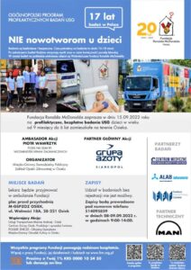 W najbliższy czwartek (15 września) w Osieku w ramach Ogólnopolskiego Programu Profilaktycznych Badań Ultrasonograficznych Dzieci Fundacji Ronalda McDonalda, odbędzie się II edycja akcji „NIE nowotworom u dzieci”. Początek o godzinie 9:00. Akcja potrwa do godziny 17:00.