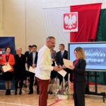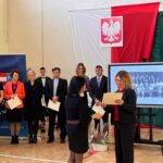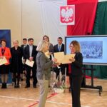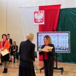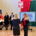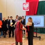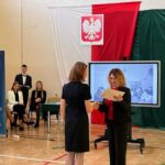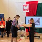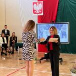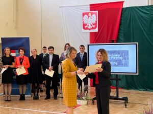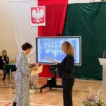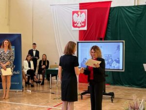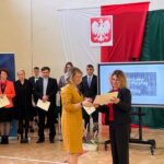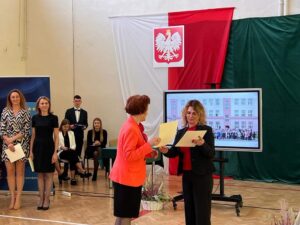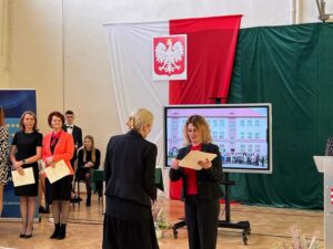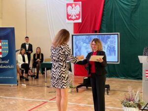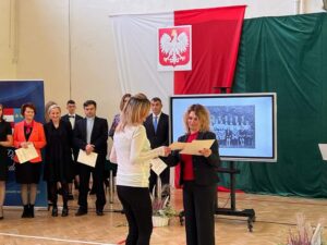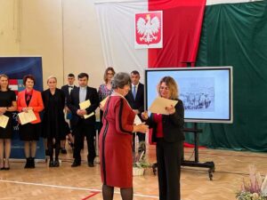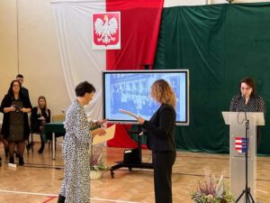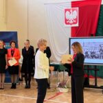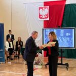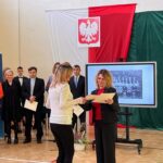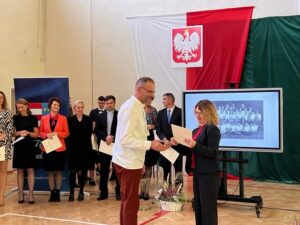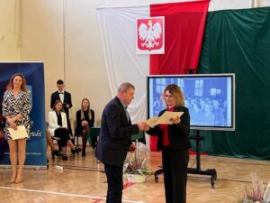 Wicestarosta Paweł Niedźwiedź zwraca uwagę na prezent, jako szkoła otrzymała od swojego absolwenta – prezesa Trybunału Konstytucyjnego profesora Jerzego Stępnia: