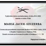 Uroczystości pogrzebowe Marii Jacek – historyka sztuki i działaczki kultury związanej ze Stalową Wolą, Niskiem i Sandomierzem odbędą się w najbliższy poniedziałek – 14 listopada w Stalowej Woli.