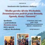 „Słodko-gorzka Afryka Wschodnia. Dwumiesięczna podróż przez Rwandę, Ugandę, Kenię i Tanzanię” to tytuł kolejnego wydarzenia z cyklu Sandomierskie Spotkania z Kulturą organizowanego przez Niezależną Inicjatywę Kulturalną oraz Sandomierskie Centrum Kultury. Gościem spotkania podróżniczego będzie Michał Jońca.