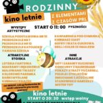 W programie: występy artystyczne, stoiska z loterią fantową, rękodziełem, książkami, a także kawiarenka pod chmurką, kiermasz ciast, gry, zabawy, konkursy, dmuchane zjeżdżalnie i wiele innych. O godzinie 20.30 seans kinowy na świeżym powietrzu.