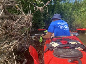 Zbiórka odpadów tradycyjnie odbyła się na kajakach, z których dużo łatwiej było zbierać dryfujące na