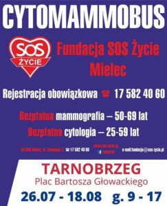 Cytomammobus Fundacji SOS Życie stanie we wtorek, 26 lipca na placu Bartosza Głowackiego. Kobiety w wieku od 50 do 69 lat będą mogły w nim wykonać bezpłatną mammografię, a panie od 25-59 roku życia – cytologię. Rejestracja odbywa się telefonicznie w godzinach od 8.00 do 17.00 pod numerem 17 582 40 60. Akcja prowadzona jest w ramach programów profilaktycznych wczesnego wykrywania raka piersi oraz raka szyjki macicy. Badania finansuje Narodowy Fundusz Zdrowia. Cytomammobus będzie dostępny w Tarnobrzegu do 18 sierpnia w godzinach od 9.00 do 17.00.