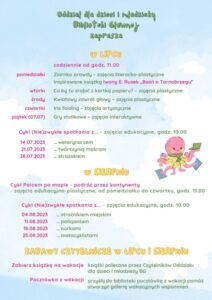 Miejska Biblioteka Publiczna w Tarnobrzegu przygotowała dla dzieci wakacyjne spotkania i zajęcia pod wspólną nazwą ,,Wakacje bajeczne, bo biblioteczne!”. W programie przewidziano cykl ,,(Nie)zwykłe spotkania z…”, głośne czytanie, zajęcia literacko-plastyczne, literacko-edukacyjne i muzyczne. Spotkania odbywają się przez całe wakacje od poniedziałku do piątku w bibliotece głównej oraz filiach bibliotecznych według harmonogramu dostępnego na stronie internetowej biblioteki.