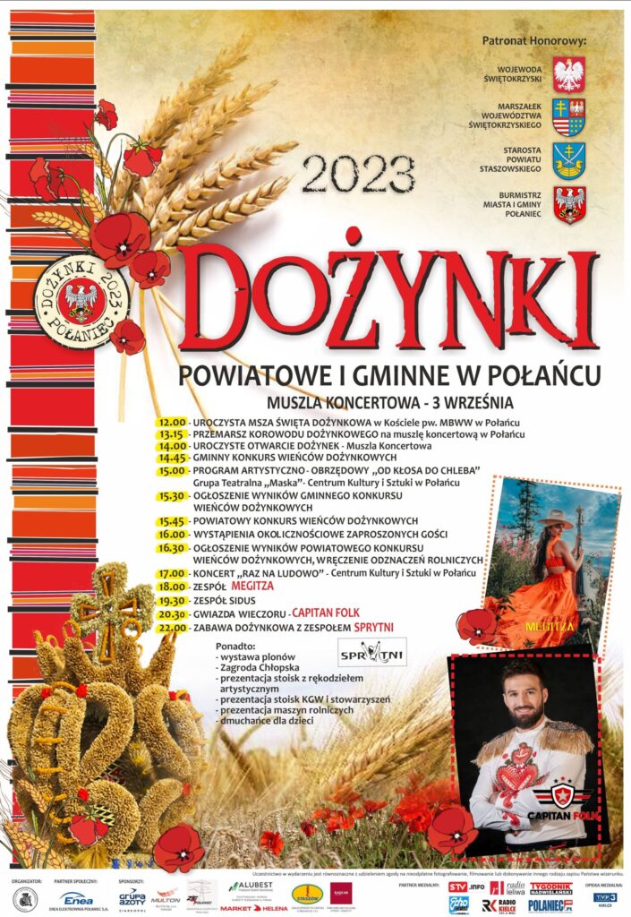 Część muzyczna wydarzenia rozpocznie się o godz. 17.00 koncertem 'Raz na Ludowo” w wykonaniu dzieci i młodzieży z Centrum Kultury i Sztuki w Połańcu. O godz. 18.00 wystąpi MEGITZA, zespół o góralskich, korzeniach. W folkowym repertuarze zaprezentuje się także zespół SIDUS, a o godz: 20.30 wystąpi gwiazda wieczoru CAPITAN FOLK.