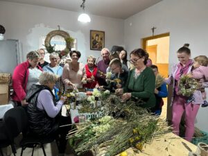 – Cykliczne warsztaty rękodzielnicze – międzypokoleniowe warsztaty rozpoznawania i nazywania zbóż i ziół oraz warsztaty wicia wieńca dożynkowego i wykonanie wieńca.