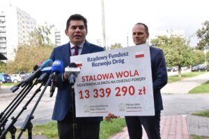 Blisko 15,7 miliona złotych Stalowa Wola otrzymała w kolejnym rozdaniu środków z Funduszu Rozwoju Dróg. O dofinansowaniu wraz symbolicznym przekazaniem czeków poinformowali na konferencji wiceminister Infrastruktury Rafał Weber i prezydent Stalowej Woli Lucjusz Nadbereżny. Pieniądze będą przeznaczone na dwie inwestycje drogowe. Mniejsza kwota 2,3 miliona złotych będzie przeznaczona na dokończenie rozbudowy ulicy Jaśminowej na osiedlu Charzewice, a dokładniej modernizację ulicy Starowiejskiej biegnącej od ulicy Brandwickiej i łączącej się z Jaśminową. Zaś większa, ponad 13,3 miliona złotych pozwoli na przebudowę od lat czekającego na modernizację układu komunikacyjnego na osiedlu Poręby. O dofinansowaniu tej dużej inwestycji mówił wiceminister: