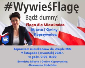 Z okazji obchodów 105. rocznicy odzyskania przez Polskę Niepodległości mieszkańcy Koprzywnicy mogą dziś otrzymać bezpłatnie biało-czerwone flagi. Akcja ma zachęcić mieszkańców do wywieszania flag w dniu 11 listopada.